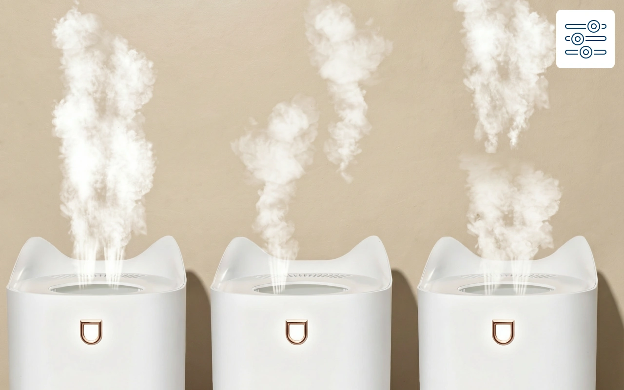Du kan kontrollera intensiteten genom att välja mellan kontinuerligt, intermittent eller alternerande läge. Denna flexibilitet säkerställer att den optimala luftfuktighetsnivån alltid upprätthålls.