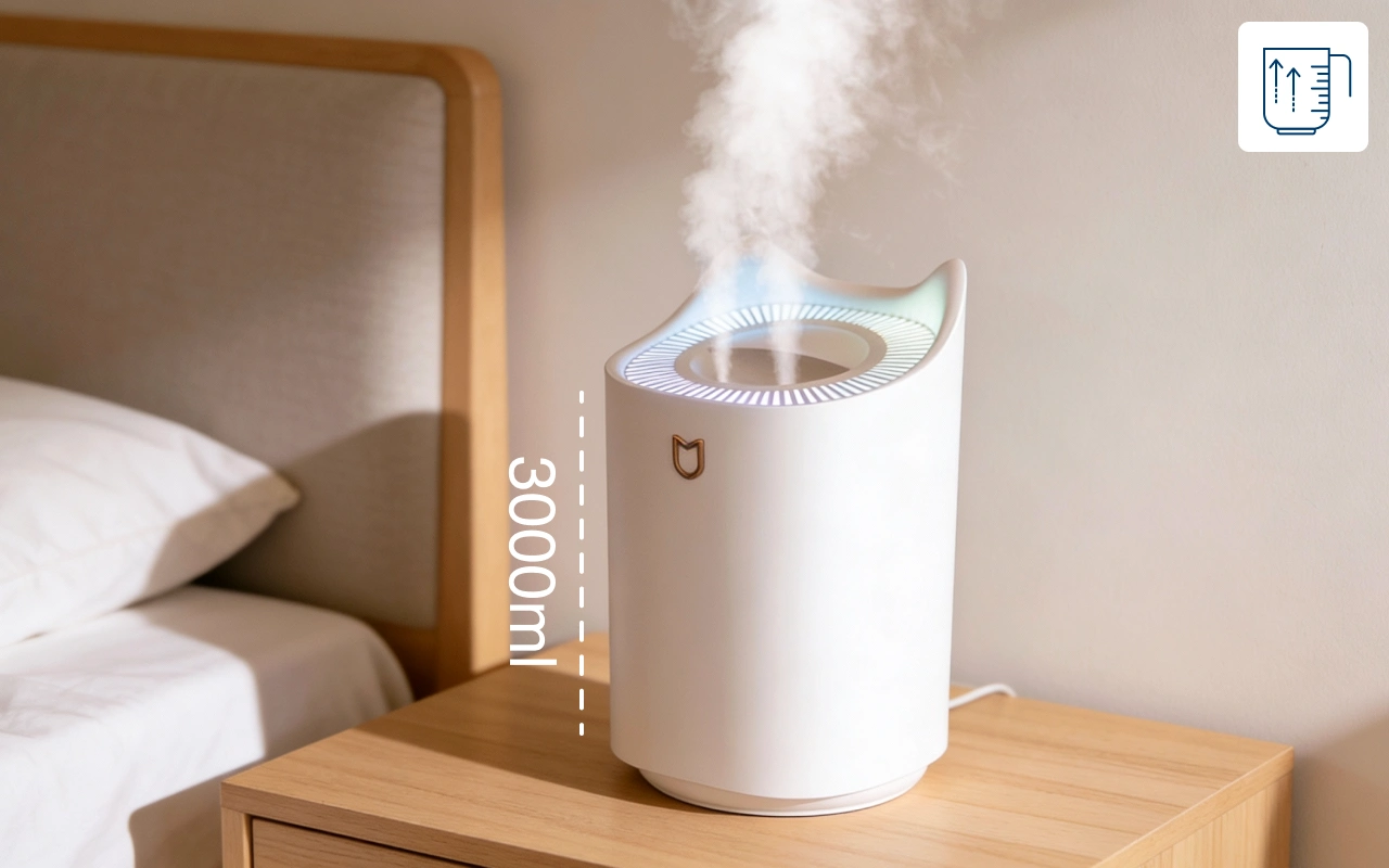 Vår luftfuktare har två munstycken, vilket gör att den kan täcka större områden. En mer fuktig miljö kan hjälpa till att förebygga torr hud och bihålebesvär.