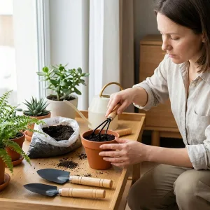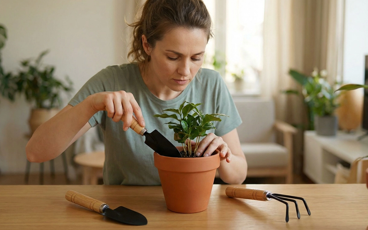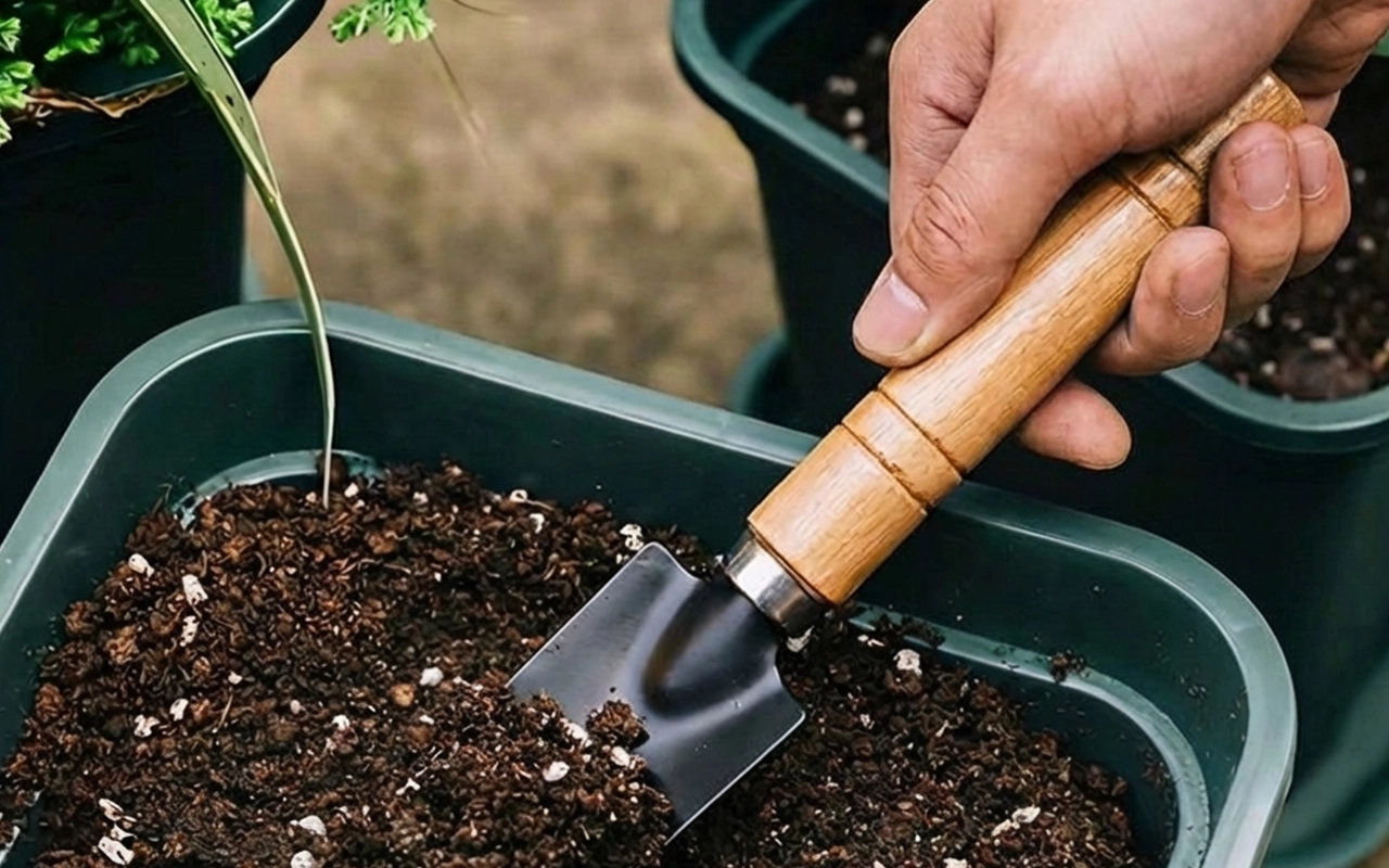 Flytta jord snyggt runt stjälkar utan spill. De smala planteringarna hjälper till att skydda känsliga rötter.