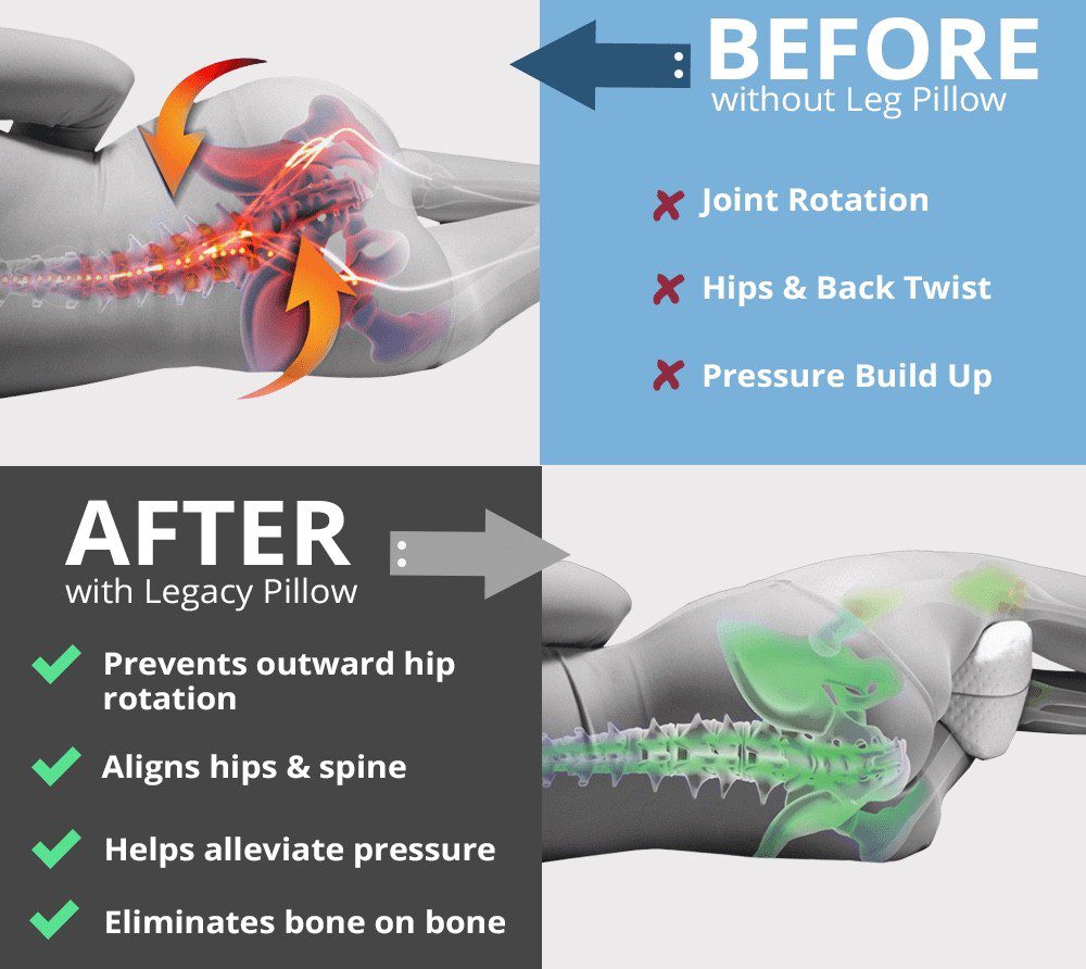 - Sidosovare — Att sova på sidan kan lägga tryck på din ryggrad, höfter och ischias. Konturkudden dämpar dina knän och omsluter dina ben, vilket minskar belastningen på leder samtidigt som den återställer din nedre ryggs justering för att lindra obehag i rygg, höft, ben, knä och ischiasnerv.